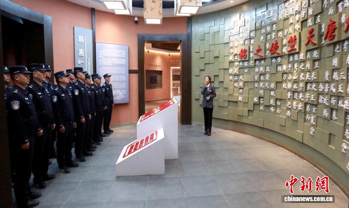在大唐天竺使之銘陳列館,一塊承載千年歷史的摩崖石刻成為民警們的“第一課”。該陳列館以石刻為核心,通過珍貴文物、歷史文獻(xiàn)與場景復(fù)原,系統(tǒng)呈現(xiàn)了古代邊關(guān)在中外文明互鑒、邊疆治理中的關(guān)鍵作用。民警們仔細(xì)觀看展品,深刻感悟先輩開拓邊關(guān)、守護(hù)疆土的堅(jiān)韌擔(dān)當(dāng)。