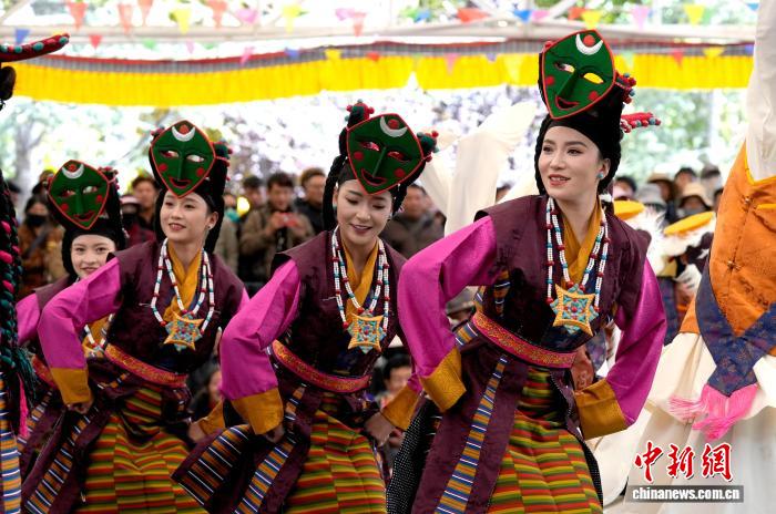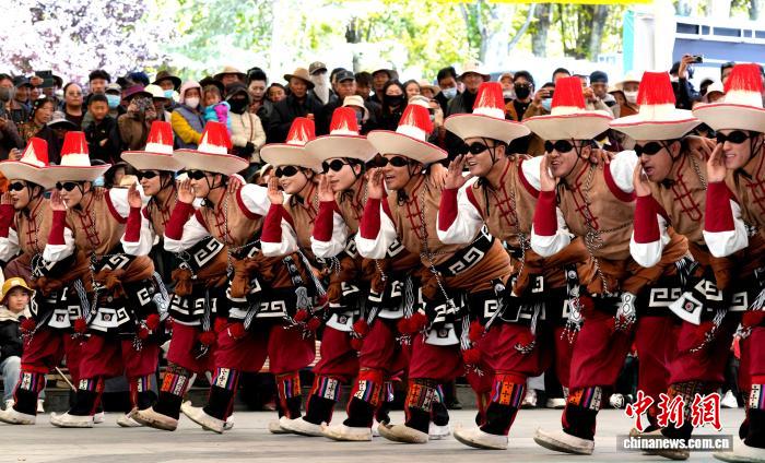 10月19日,“格?;ū崩_市第六屆縣(區(qū))藝術(shù)團文藝調(diào)演頒獎活動在布達拉宮腳下的宗角祿康公園舉行?,F(xiàn)場,拉薩市各縣(區(qū))藝術(shù)團帶來精彩節(jié)目。圖為文藝調(diào)演頒獎活動上的文藝表演。中新社記者 李林 攝