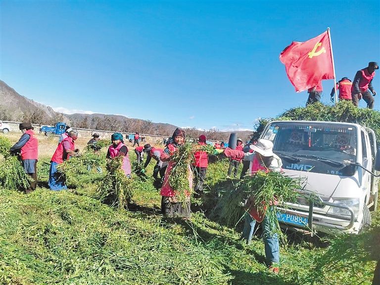圖為打隆鎮(zhèn)志愿者幫助困難家庭秋收。記者 巴桑旺姆 攝
