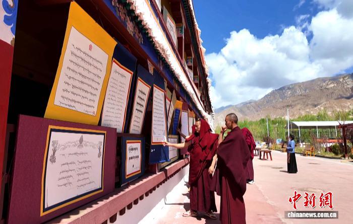 圖為色拉寺僧人結(jié)伴觀賞藏文書(shū)法作品展。貢桑拉姆 攝