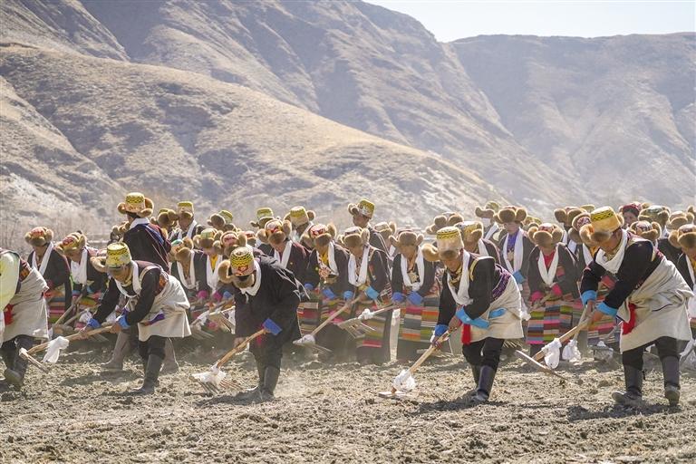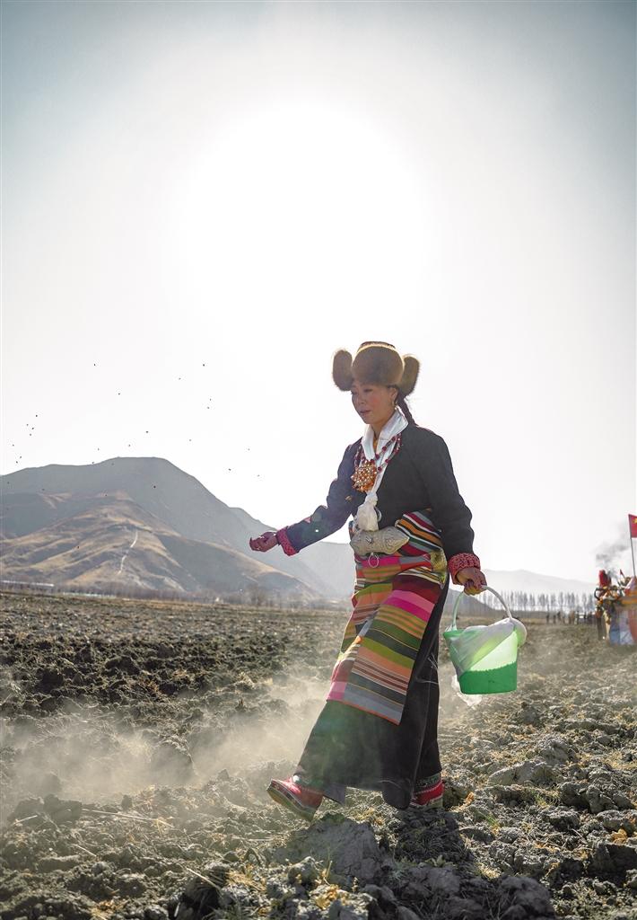 春耕儀式開始之前,犁手們依次吃糌粑、敬青稞酒、煨桑、獻(xiàn)哈達(dá),每個(gè)人臉上都流露著幸福的笑容?!拌F牛”們?cè)谔镩g一字排開,浩浩蕩蕩駛進(jìn)農(nóng)田,后面跟著盛裝打扮的姑娘,她們手持種子、肥料撒入農(nóng)田。這是來自春天的希望,希望秋收滿倉(cāng)。