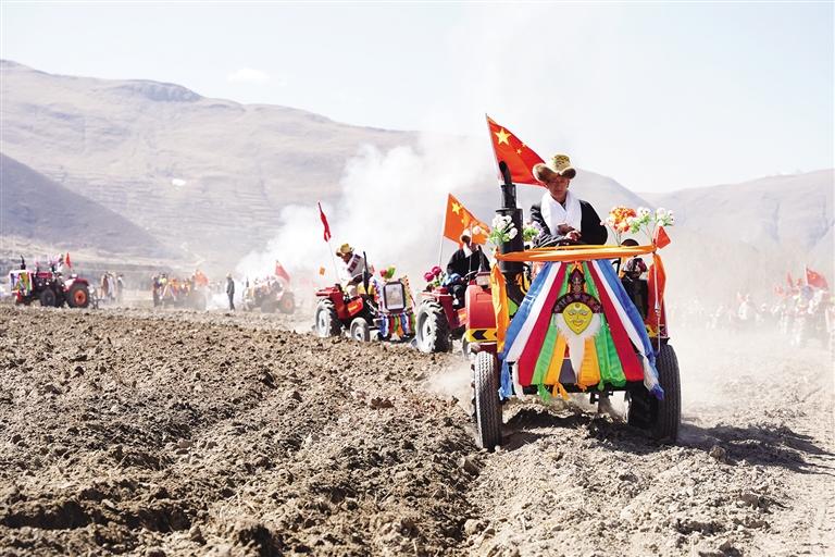 在克松村的田地旁,村民將拖拉機(jī)裝扮成“鐵牛”,用藏戲面具、彩色瓔珞等“打扮”一番,插著彩旗格外好看。村民還獻(xiàn)上哈達(dá)與自家釀的青稞酒給犁手、撒種子的姑娘和“鐵牛”,就開始了新春第一犁。