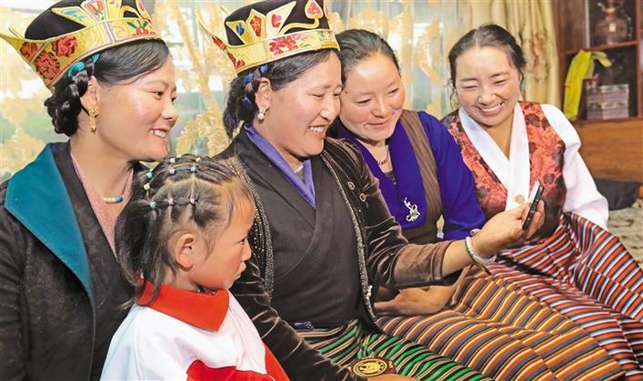 墨竹工卡縣群眾通過手機(jī)收看慶祝大會(huì)。記者 洛桑 次旺 唐斌 潘多 攝