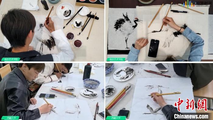 西藏大學藝術學院學生與南京藝術學院學生在線上共同繪制黑頸鶴。智慧樹平臺供圖