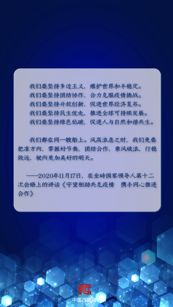 讓我們攜起手來,堅持和平、發(fā)展、合作、共贏,共同解決當(dāng)前世界經(jīng)濟(jì)以及國際貿(mào)易和投資面臨的問題,一起走向更加美好的未來! [詳細(xì)]