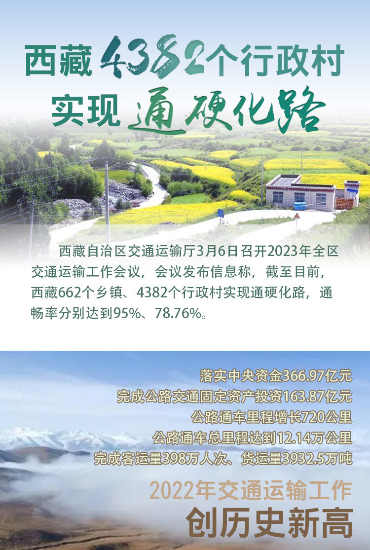 西藏自治區(qū)交通運輸廳3月6日召開2023年全區(qū)交通運輸工作會議,會議發(fā)布信息稱,截至目前,西藏662個鄉(xiāng)鎮(zhèn)、4382個行政村實現(xiàn)通硬化路,通暢率分別達到95%、78.76%。 [詳細(xì)] -