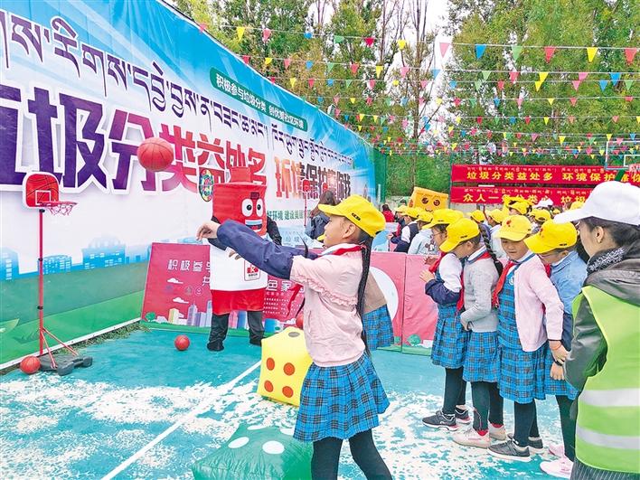 在拉薩市城關(guān)區(qū)組織開展的“不忘初心、牢記使命”主題教育暨“垃圾分類黨員先行 守護凈土人人有責”活動現(xiàn)場,學(xué)生代表參加趣味游戲。