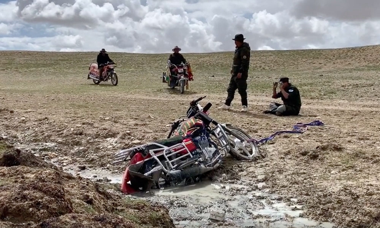 騎著摩托車行駛在草原上,危險(xiǎn)隨時(shí)都有可能發(fā)生。沒過多久,隊(duì)員們的一輛摩托車便陷入泥坑中,兩名隊(duì)員試圖將摩托車拽出來卻屢試無果。無奈之下只能打電話叫隊(duì)友過來幫忙,摩托車才得以脫困。類似的狀況,野保員們早已習(xí)以為常,簡單收拾之后,他們就又出發(fā)了。