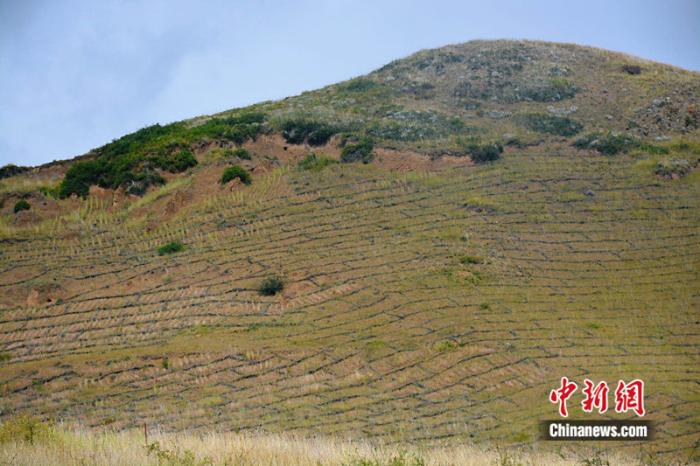 走進四川省阿壩州若爾蓋縣轄曼鎮(zhèn)西倉村治沙點,山坡上巨大的“棋盤”格外醒目。縣林草局生態(tài)修復(fù)股助理工程師涂勝介紹,這是用于治理草原沙化的高山柳沙障。