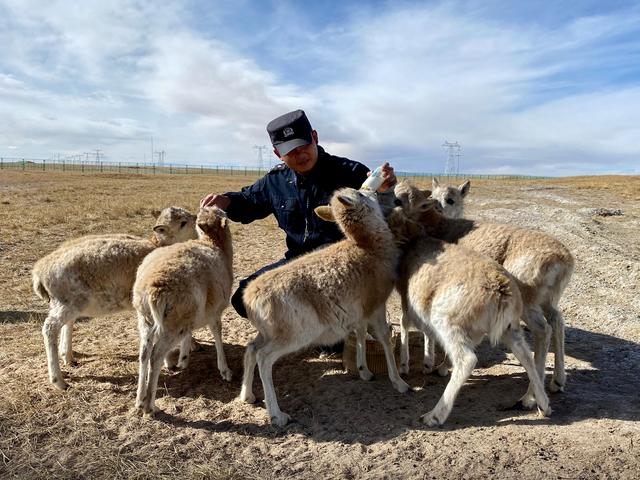12月7日,在給藏羚羊幼仔喂奶前,可可西里索南達(dá)杰保護(hù)站站長趙新錄(中)用嘴測試奶溫。