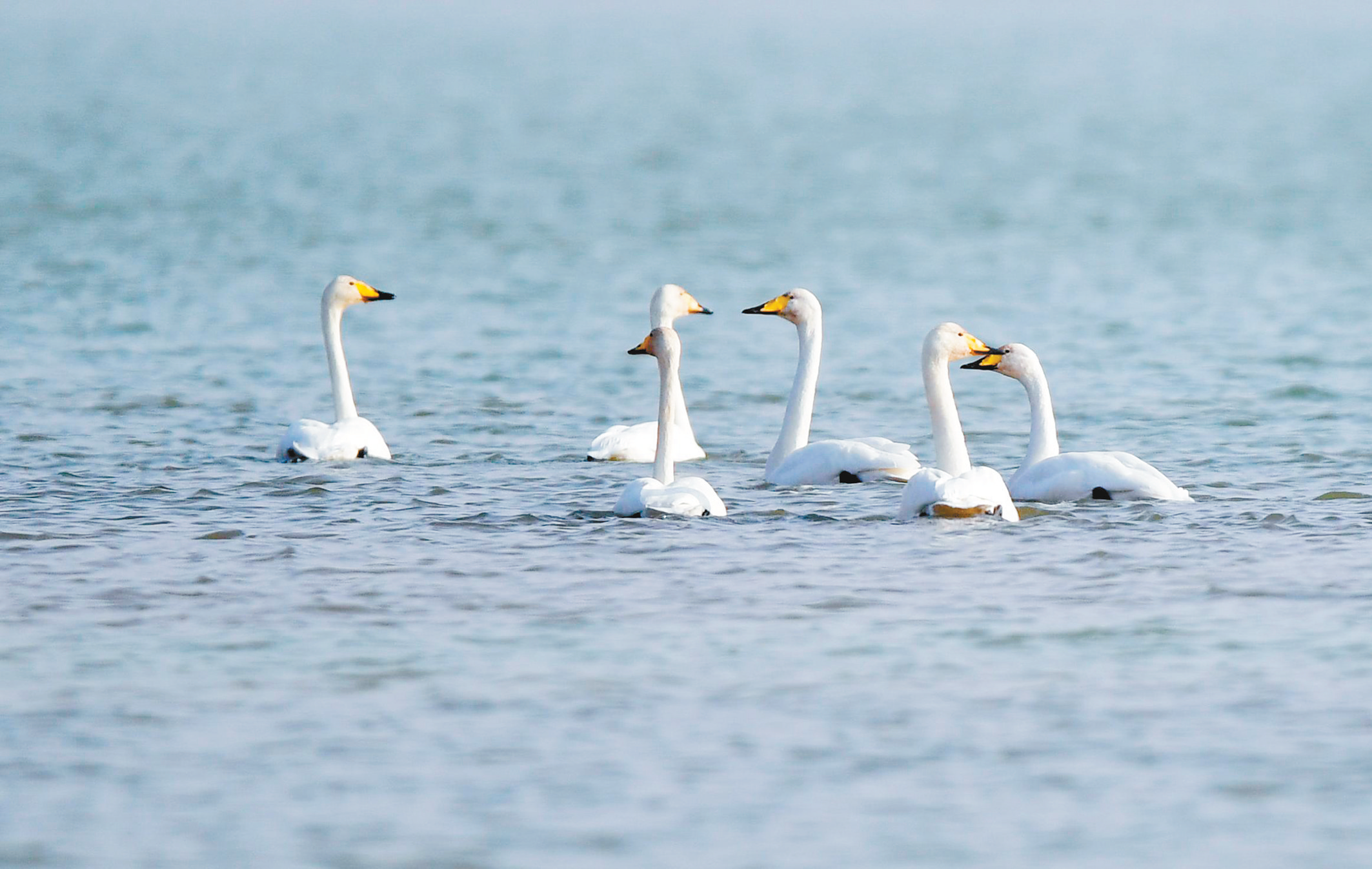 在青海省海東市化隆回族自治縣,天鵝翔集黃河邊,帶來(lái)冬日里的勃勃生機(jī)。
