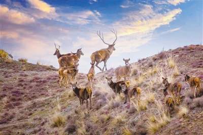 在德令哈市雅撒圖地區(qū)成群結(jié)隊的白唇鹿在山上自由奔跑、覓食。攝影:郭曲太 戴永峰