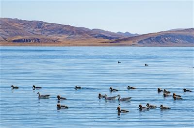 羊卓雍錯(cuò)自2014年被納入國(guó)家良好湖泊生態(tài)環(huán)境保護(hù)試點(diǎn)工程項(xiàng)目以來(lái),羊卓雍錯(cuò)周邊生態(tài)環(huán)境持續(xù)向好,棲息繁衍的野生動(dòng)物數(shù)量逐年增多。這是近日拍攝的羊卓雍錯(cuò)湖面上的水鳥。新華社記者 孫非 攝