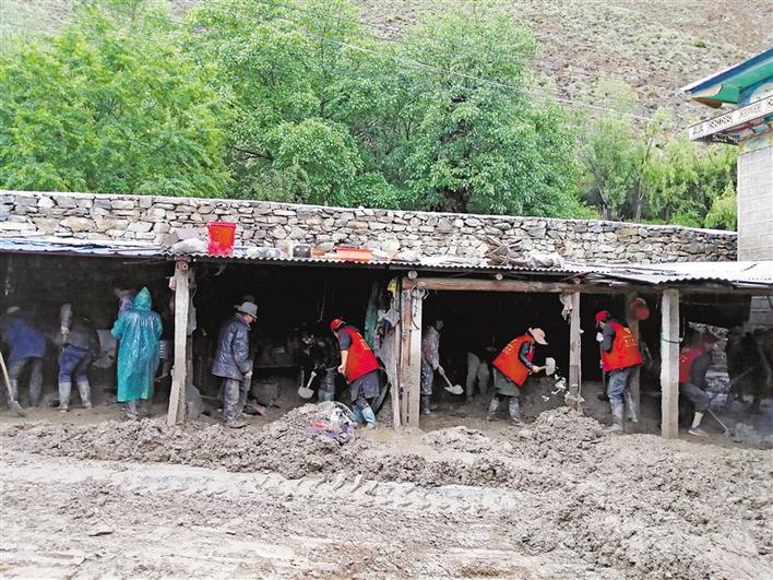 圖為林芝市朗縣滾村“兩委”、駐村工作隊(duì)組織村民開(kāi)展清理淤泥活動(dòng)。 史金茹 攝