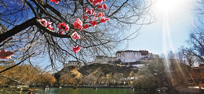 3月4日,人們在拉薩龍王潭公園賞花、拍照。新華社記者 覺果 攝