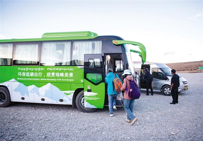 游客在珠穆朗瑪峰景區(qū)停車場(chǎng)轉(zhuǎn)乘環(huán)保客車(2019年5月16日攝)。珠穆朗瑪峰景區(qū)內(nèi)自2019年5月開(kāi)始試運(yùn)營(yíng)清潔能源環(huán)保客車,以進(jìn)一步平衡珠峰地區(qū)旅游發(fā)展與環(huán)境保護(hù)需要。新華社記者 孫非 攝