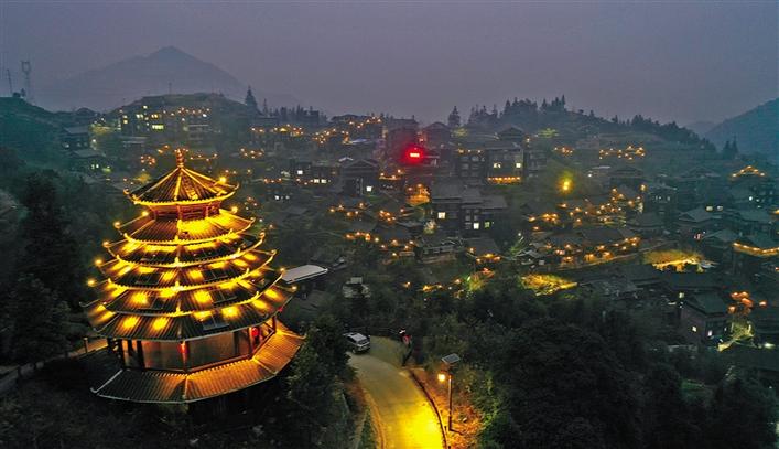 在廣西柳州市三江侗族自治縣八江鎮(zhèn)布央村,太陽(yáng)能路燈和鼓樓上的太陽(yáng)能裝飾燈讓鄉(xiāng)村的夜晚亮了起來(lái)(2020年12月28日攝,無(wú)人機(jī)照片)。 新華社發(fā) (黎寒池 攝)