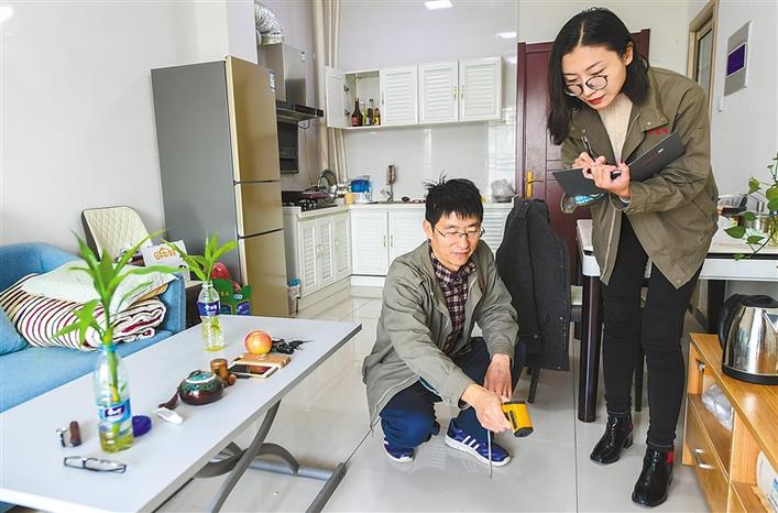 河北省安平縣一家熱力公司員工入戶測(cè)量室內(nèi)地暖溫度(2019年11月15日攝)。2018年以來(lái),安平縣利用玉米秸稈等農(nóng)林廢棄物大力推行生物質(zhì)能源供熱的供暖模式,減少污染排放,綠色節(jié)能型能源走進(jìn)了千家萬(wàn)戶。 新華社記者 李曉果 攝