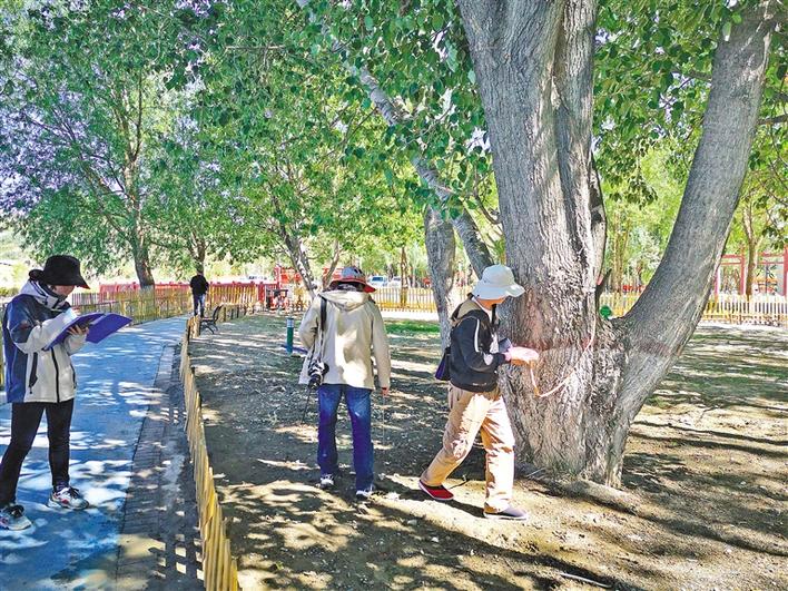 圖為西藏農(nóng)牧學院的師生在測算貢覺林卡內古樹的相關數(shù)據(jù)。記者 扎西頓珠 攝
