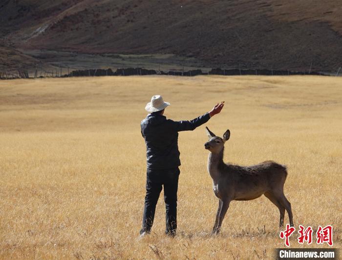 圖為西藏類烏齊馬鹿國家級(jí)自然保護(hù)區(qū)的管護(hù)員正在飼喂馬鹿。 冉文娟 攝