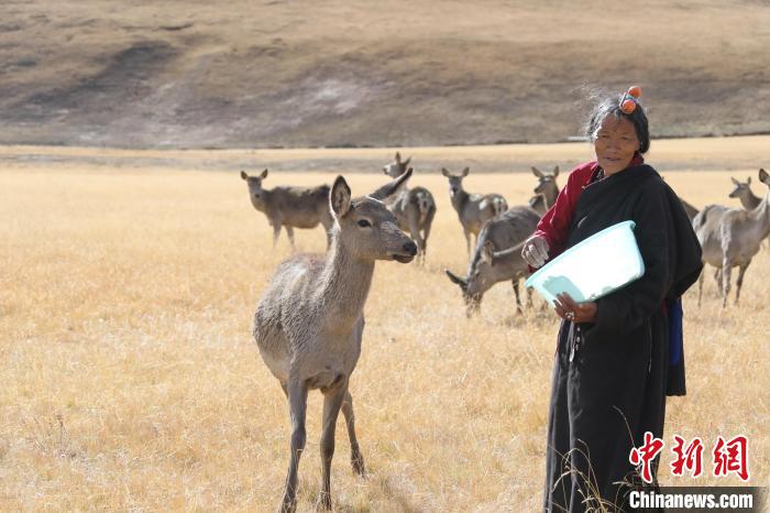 圖為和馬鹿打了一輩子交道的藏族阿媽向秋拉姆正在喂食馬鹿?!∪轿木?攝