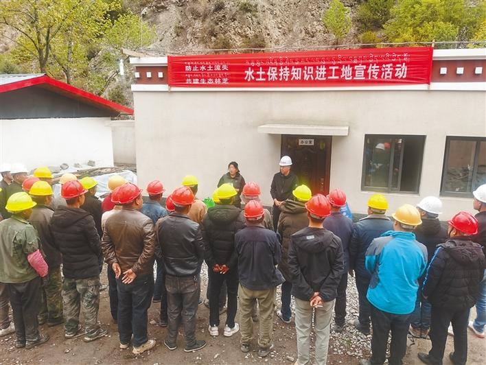 林芝市水利局工作人員在朗縣拉多鄉(xiāng)項(xiàng)目工地向一線工人和管理人員宣傳水土保持知識