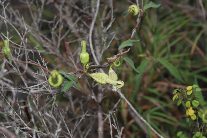 綠汁江吊燈花形態(tài)上與匙冠吊燈花近似,但該種花梗較長且疏被柔毛,花冠筒上部的直徑僅為下部的一半,花冠裂片內(nèi)部密被白色長柔毛,外輪副花冠裂片具2齒,這些特征可與其近似種明顯區(qū)別。目前,科研人員僅在易門縣綠汁鎮(zhèn)后山坡發(fā)現(xiàn)一個居群,零星的分布在干熱河谷稀樹灌草叢中,生境受人為干擾較為嚴(yán)重,根據(jù)IUCN的評估標(biāo)準(zhǔn)將其瀕危等級評估為極危。