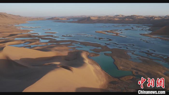 位于庫(kù)木庫(kù)里沙漠腹地的沙子湖薄冰化盡,蔚藍(lán)的湖水與金黃的沙山、遼闊的碧空交相輝映。 尚鵬 攝