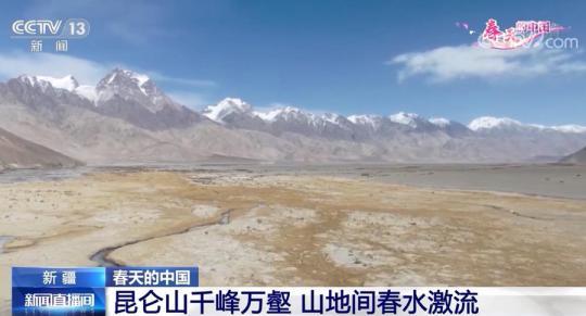 立春后,新疆境內(nèi)的昆侖山山色黑白相交,更加雄渾有力,藍(lán)天、白云、雪山構(gòu)成了一幅壯美的畫卷。和高山的積雪不同,山下的冰河融化、春水激流,野生牦牛等動物聚集在河邊暢飲、吃草,彰顯出春天的勃勃生機(jī)。