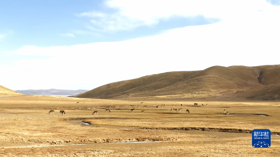 3月12日,在三江源國(guó)家公園黃河源園區(qū)內(nèi),一群藏野驢在草灘上吃草。新華社記者 呂雪莉 攝