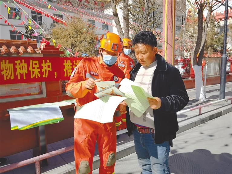 昌都市森林消防支隊邊壩縣駐防分隊隊員為群眾講解野生動植物保護宣傳手冊內(nèi)容。 記者 桑鄧旺姆 攝