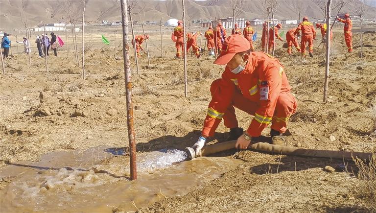 植樹造林不僅防止水土流失、調(diào)節(jié)氣候,同時(shí)也可以豐富生態(tài)資源,促進(jìn)經(jīng)濟(jì)發(fā)展等作用,是一項(xiàng)利于當(dāng)代、造福子孫的宏偉工程。春回大地萬物蘇,植樹添綠正當(dāng)時(shí)。活動(dòng)現(xiàn)場消防救援人員精神飽滿、在大隊(duì)長王治平的帶領(lǐng)下所有消防救援人員鼓足了干勁,大家相互結(jié)伴,揮動(dòng)著鐵鍬和鋤頭,挖坑、栽樹、覆土、澆水、齊心協(xié)力、配合默契,認(rèn)真細(xì)致地完成每一道工序,整個(gè)植樹活動(dòng)現(xiàn)場到處都是忙碌的身影?!翱油谏钜稽c(diǎn),這樣樹木才容易植活”,經(jīng)驗(yàn)豐富的二級(jí)消防士洛桑頓珠一旁耐心指導(dǎo)他的隊(duì)友。“動(dòng)作麻利兒點(diǎn),不然完不成我們班今天的任務(wù)了”,該大隊(duì)四班班長杜鵬給他的班級(jí)人員做動(dòng)員?!敖衲晔俏伊x務(wù)植樹第8年。近年來,我們?nèi)湛t的綠化發(fā)展變化很大,作為土生土長的日喀則人,我們要種好每一顆樹,愛護(hù)好每一棵樹苗,為日喀則綠化增添綠?!痹摯箨?duì)分隊(duì)長嘎瑪赤烈說道。