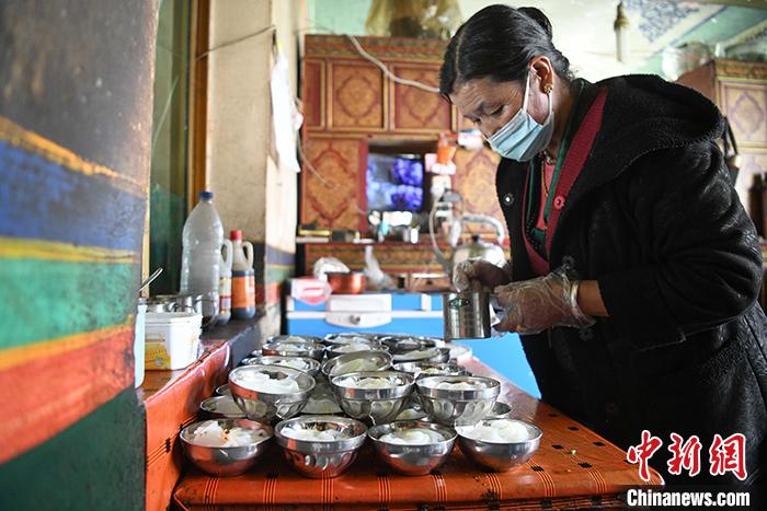 4月12日,拉薩市曲水縣色麥村村民普布卓嘎正在制作涼粉。 中新社記者 貢嘎來(lái)松 攝