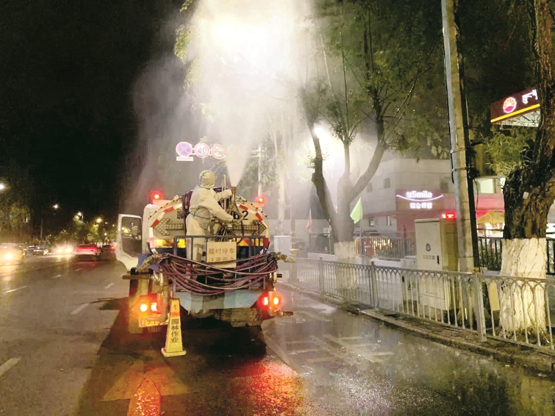 圖為園林公司工作人員正在對道路兩旁樹木進行噴藥作業(yè)。 拉薩融媒記者 次仁卓嘎攝