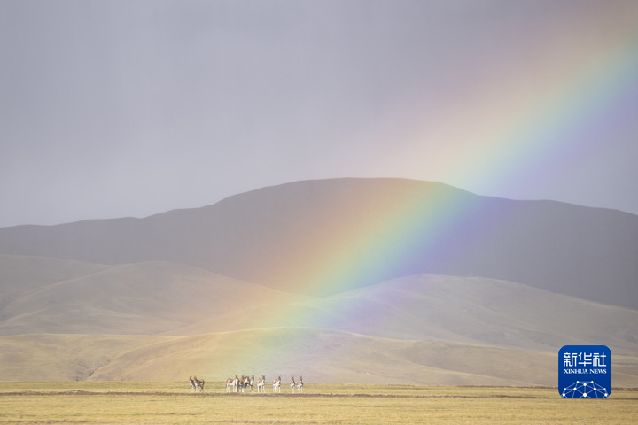 彩虹下的羌塘國家級自然保護區(qū)藏野驢。(新華社記者孫瑞博攝)
