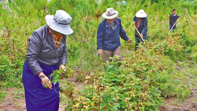 圖為村民在養(yǎng)護(hù)樹莓。