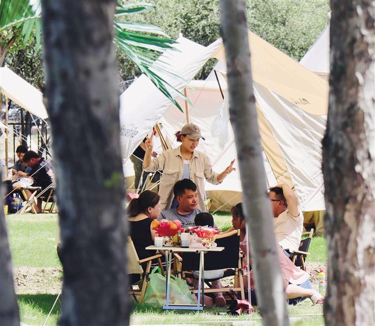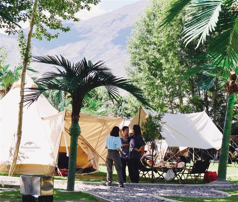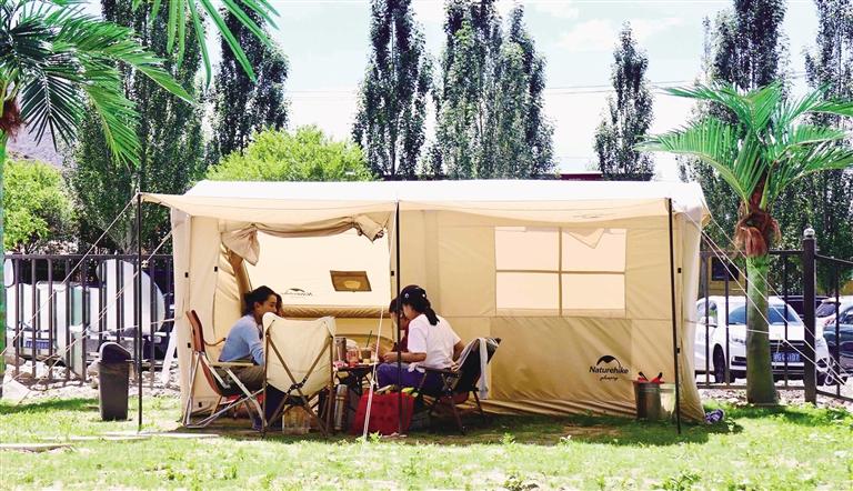 在拉薩,還未踏進林卡營地,便能聞到烤肉的香氣,尋著歡笑聲走去,你會發(fā)現(xiàn),這些林卡營地宛如“桃花源”呈現(xiàn)在眼前。不論是藏式林卡營地還是西式露營地,都有共同的“魔力”——把“煩惱”擋在門外。一頂頂白色的帳篷和天上的朵朵白云相呼應(yīng),綠色的草地是夏天才有的限定“地毯”,抬頭,油綠而繁茂的樹葉在微風中婆娑,似乎在回應(yīng)著樹下人群的歡笑。讓人不禁感嘆,原來,大自然才是治愈內(nèi)心最好的良藥。