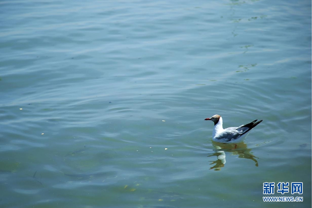 一只棕頭鷗在湖面游弋。新華網(wǎng) 馬洪婷 攝
