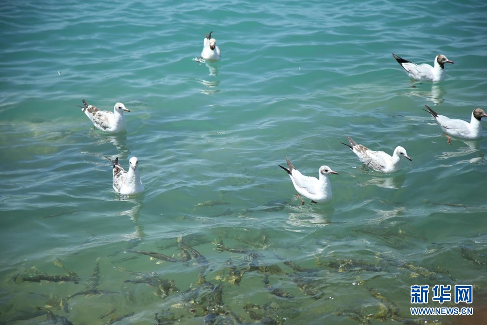 水面上,棕頭鷗隨波蕩漾;湖水里,青海湖裸鯉悠閑游弋。新華網(wǎng) 馬洪婷 攝