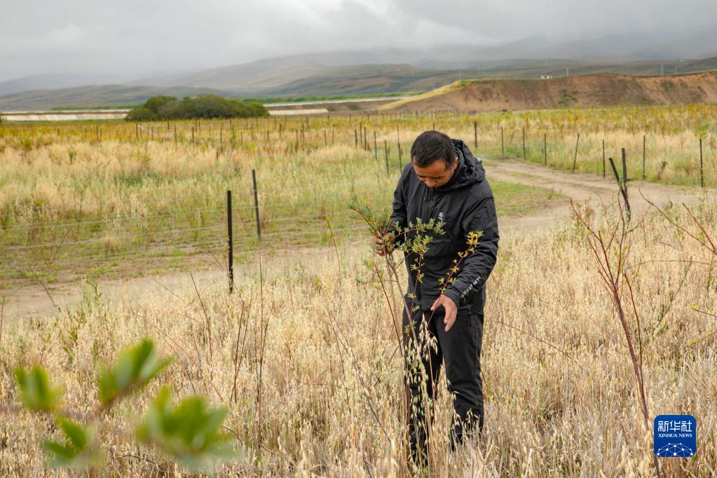 瑪曲縣自然資源局高級工程師馬建云在黃河瑪曲段干流沿岸一處阻沙林帶建設(shè)區(qū)域觀察植被生長情況(9月16日攝)。新華社記者 郎兵兵 攝