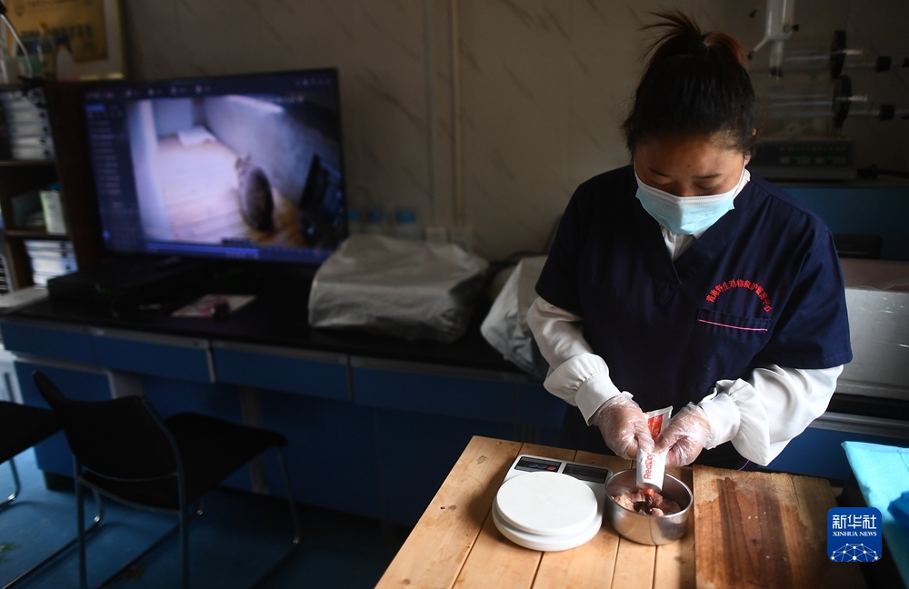 9月18日,青海野生動物救護(hù)繁育中心工作人員虎文蓉在給荒漠貓準(zhǔn)備的晚餐中加入營養(yǎng)膏。新華社記者 張宏祥 攝
