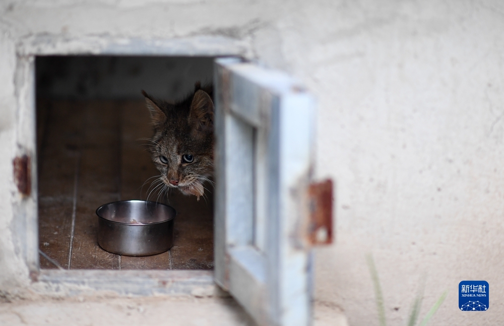 9月18日,受救護(hù)的荒漠貓?jiān)谇嗪R吧鷦游锞茸o(hù)繁育中心進(jìn)食。新華社記者 張宏祥 攝