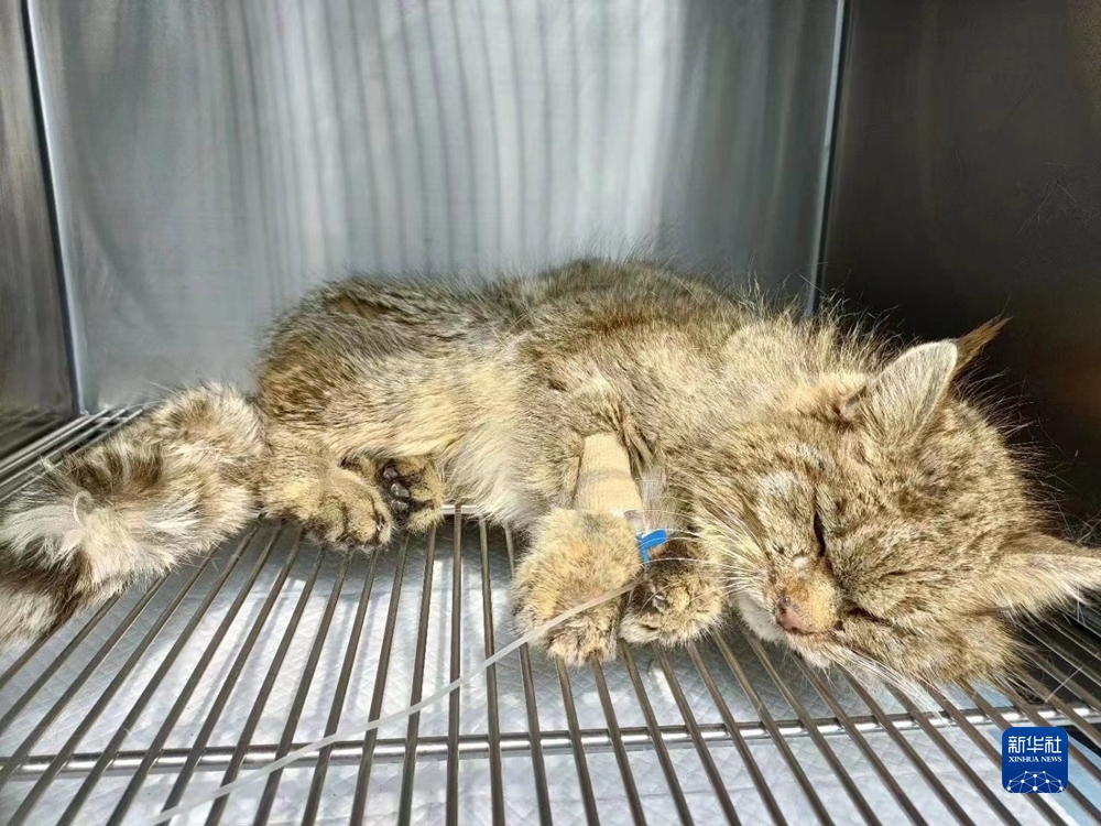 2022年3月21日,受救護(hù)的荒漠貓?jiān)谇嗪R吧鷦游锞茸o(hù)繁育中心接受治療。新華社發(fā)(青海野生動物救護(hù)繁育中心供圖)