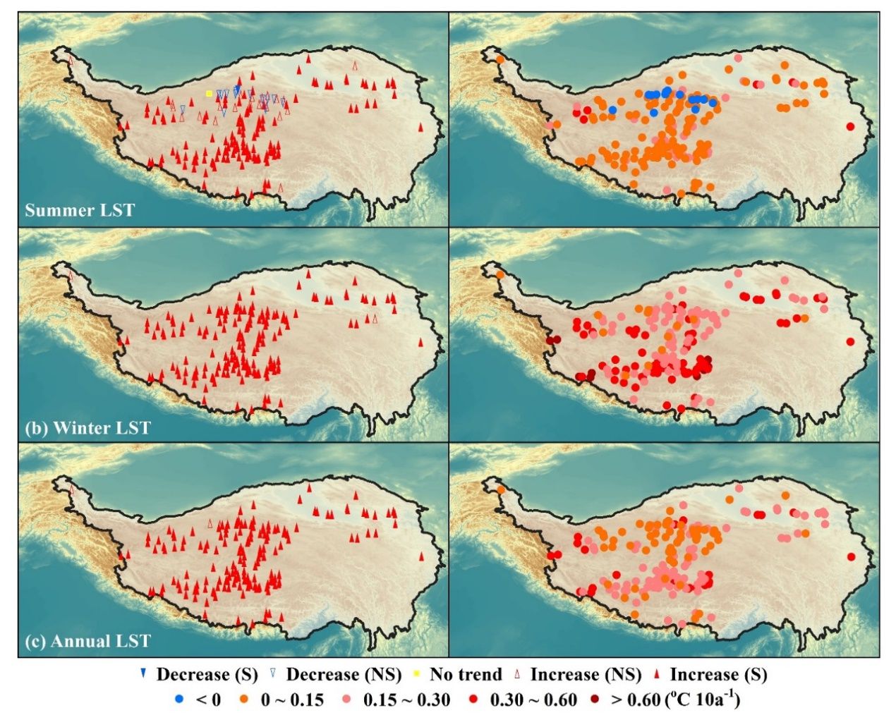 基于重建的湖面溫度時間序列,團隊揭示了青藏高原湖面溫度的時空演化規(guī)律。研究發(fā)現(xiàn),近40年來(1978—2017年)青藏高原絕大多數(shù)湖泊的表面溫度均呈上升趨勢,升溫速率約每10年0.01~0.47℃,且冬季升溫比夏季更顯著,南部湖泊升溫速率高于北部湖泊。此項研究成果對于未來進(jìn)一步評估氣候變化對青藏高原湖泊水熱收支變化的影響具有重要價值。