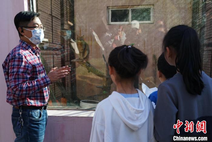 圖為青海野生動物救護繁育中心副主任向?qū)W生介紹荒漠貓?!●R銘言 攝