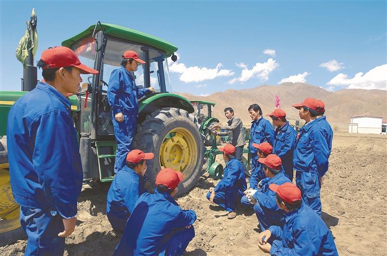 發(fā)展教育脫貧一批。2016年以來,累計(jì)落實(shí)義務(wù)教育學(xué)校基本建設(shè)資金84.4億元,實(shí)施教育基礎(chǔ)建設(shè)項(xiàng)目1433個,資助建檔立卡和農(nóng)村低保大學(xué)生累計(jì)6.06萬人次,落實(shí)資助資金3.55億元。圖為西藏自治區(qū)白朗縣邀請山東農(nóng)機(jī)技師對當(dāng)?shù)刎毨糸_展培訓(xùn)。
