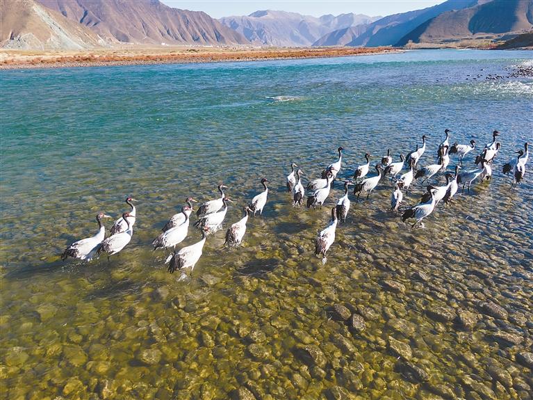 隨著西藏不斷加大黑頸鶴棲息地保護(hù)力度,黑頸鶴的生存環(huán)境進(jìn)一步改善。每年十月中下旬,大批“高原精靈”——黑頸鶴從藏北高原飛到拉薩河谷,它們?cè)谵r(nóng)田、沼澤地里覓食嬉戲,享受冬日暖陽(yáng)。