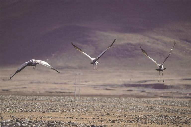 在西藏,黑頸鶴從越冬地到繁殖地有兩條線路:一條是拉薩到色林措,另一條則是從日喀則到色林措。整體來說,是從雅魯藏布江中游河谷黑頸鶴國家級自然保護區(qū)飛往色林措黑頸鶴保護區(qū),兩個保護區(qū)之間有一條固定的黑頸鶴遷徙路線,每年黑頸鶴會在3月中旬從越冬地雅江中游河谷及其支流拉薩河、年楚河流域的“一江兩河”地區(qū),飛去羌塘北部草原繁育后代;又會于11月中旬從繁殖地那曲的班戈縣、申扎縣、嘉黎縣,阿里的日土縣、普蘭縣,日喀則的昂仁縣,拉薩的當(dāng)雄縣返回到越冬地。對于雅江中游河谷來說,它是冬候鳥;對于羌塘北部草原來說,它是夏候鳥。
