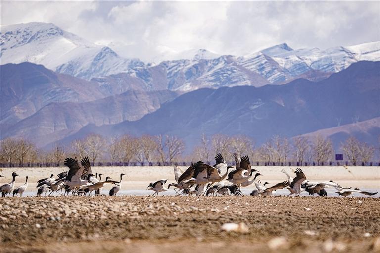 黑頸鶴是國家一級保護動物,在藏語中稱為“沖沖”。主要棲息在海拔2500米至5000米的高原、草甸、沼澤地帶。拉薩北部的林周縣平均海拔約4200米,是黑頸鶴的主要越冬地之一。最近這段時間,對拉薩市林周縣野保員們來說,一邊要忙自家的農(nóng)活,一邊還要巡查候鳥情況。“已經(jīng)有一小部分飛走了,估計再過半個月都會陸續(xù)飛走?!?月23日上午,野保員旦增告訴記者,在虎頭山水庫和卡孜水庫越冬的候鳥有一部分已經(jīng)飛走了。野保員口中的“飛走”便是遷徙,遷徙是候鳥的本能,一年一年,跟隨時間的召喚,完成兩次遷徙:繁殖和越冬。