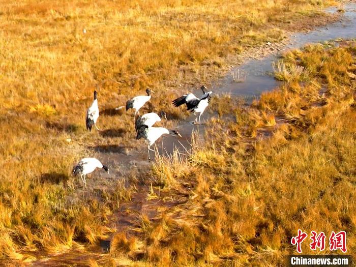 金秋十月,位于青海湖北岸的草原一片金黃。攝影愛好者在青海省海北藏族自治州剛察縣吉爾孟鄉(xiāng)日格加柔地區(qū),拍攝到六只黑頸鶴在這里“安家落戶”,它們或擠在一起沐浴秋日的暖陽,或三五成群覓食嬉戲、閑庭信步,為草原增添了一份靈動與生機(jī)。黑頸鶴被稱為“高原仙子”“鳥類大熊貓”,是全球十五種鶴類中唯一在高原繁殖和棲息的鶴類。